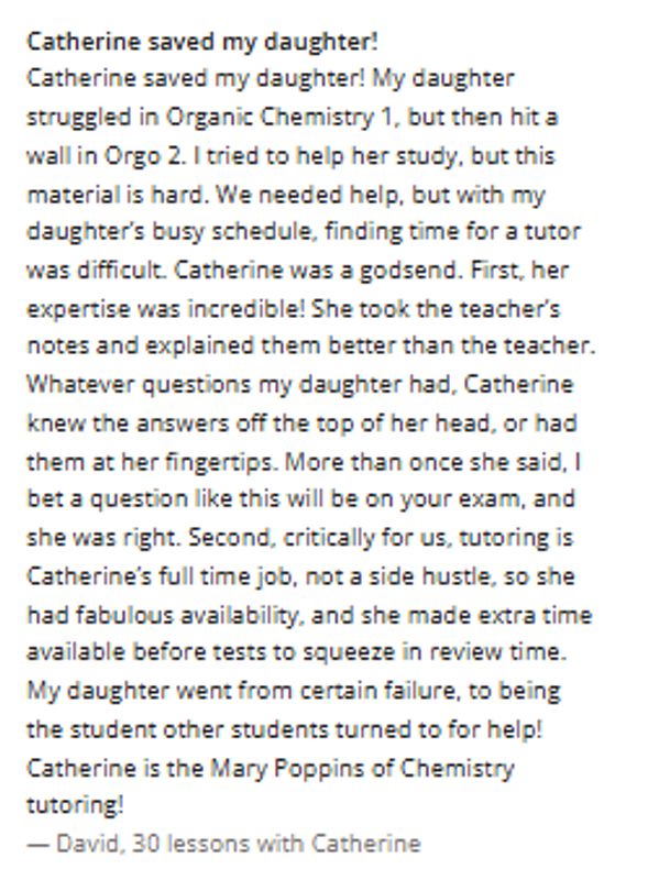 I have helped students from various levels. Whether you are in an Ivy League University, a state college, a community college, or a high school I can tutor to your level! Pre-med? Nursing? Pharmacy? Yes! Yes! Yes! I have helped many students prepare over the summer for their fall classes so that way they are ahead of the game.